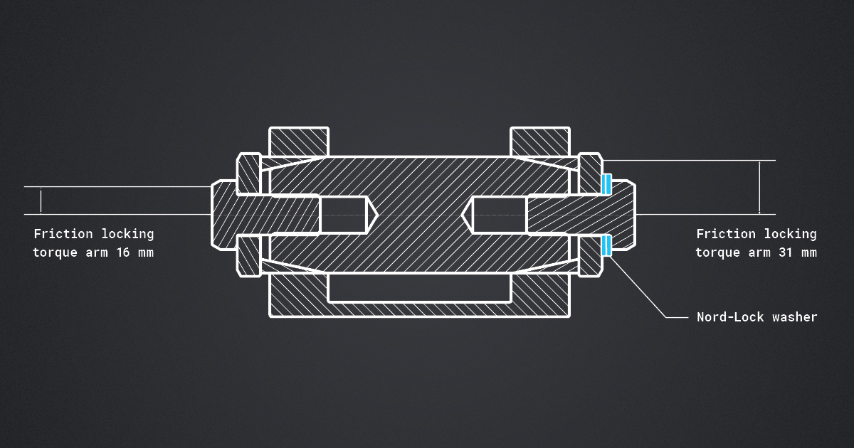 对于所有摩擦制锁效应,扭矩臂是一个关键参数。由于右侧采用双重扭矩臂设计,在相同条件下,螺栓旋转松动的难度提升约2倍(计算方式:31/16≈1.93,近似为2倍)。