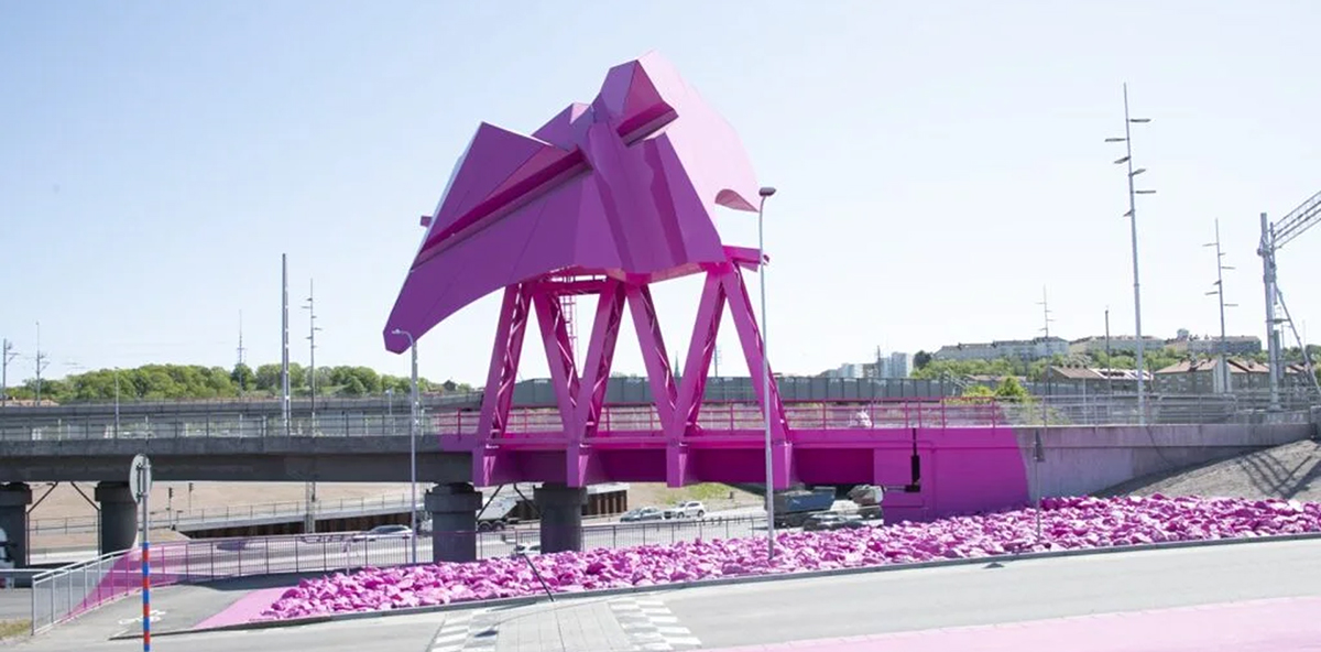 瑞典哥德堡的奥尔斯克罗肯(Olskroken)交通枢纽近期落成的公共基础设施项目,正是这种设计哲学的典范。该项目特别强调通过具有冥想特质的艺术表达来提升公共空间的精神内涵。这件名为bLINK的艺术作品由瑞典艺术家卡塔琳娜·格罗斯(Katharina Grosse)创作,以其标志性的视觉语言重新定义了交通基础设施的美学可能。这件作品傲然矗立于横贯E6高速公路的铁路桥体之上,通过充满张力的粉色调与精密的钢结构图案系统,为原本单调乏味的交通节点注入了令人惊艳的艺术生命力。