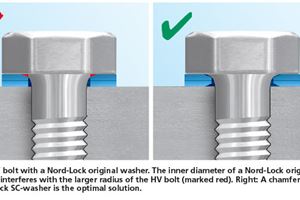 Using standard locking washers would be the easiest solution to cope with the loosening of bolted joints or to decrease retightening frequency. For structural steel parts using HV/HR-sets, this is, however, not the case. The radius under the bolt head makes the use of common locking methods with HV/HR bolt sets impossible.