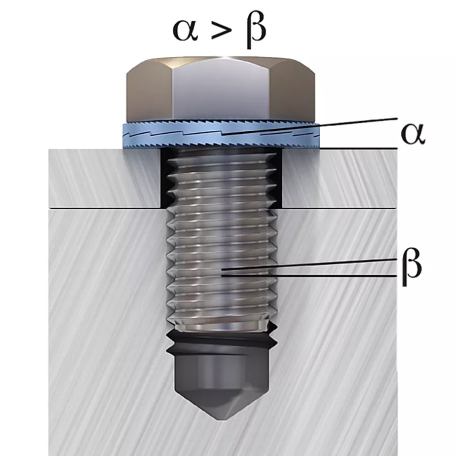 由于相互咬合的凸轮角度α大于螺距β,成对楔形制锁垫圈的膨胀量超过螺纹的相应螺距,因此形成楔形效应,任何螺栓/螺母旋转松动的倾向均会受到阻碍。