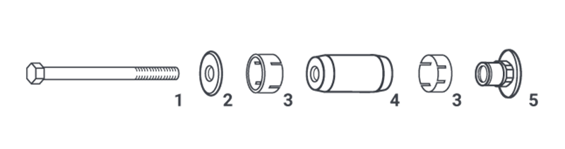 1 Bolt. 2 Washer. 3 Sleeve. 4 Axle (Pin). 5 Expander flat-headed nut for internal hexagon.